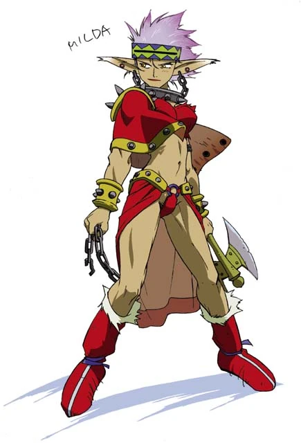 Milda (ミルダ) is a playable character from Grandia. She is a resident of Laine and exhibits incredible strength. She is a strong physical fighter and like most Lainians, cannot cast any form of magic. Milda is quick-tempered and rash but often shows a sweet side and despite only being 19, spends most of her time as a mother figure to Justin and the party.